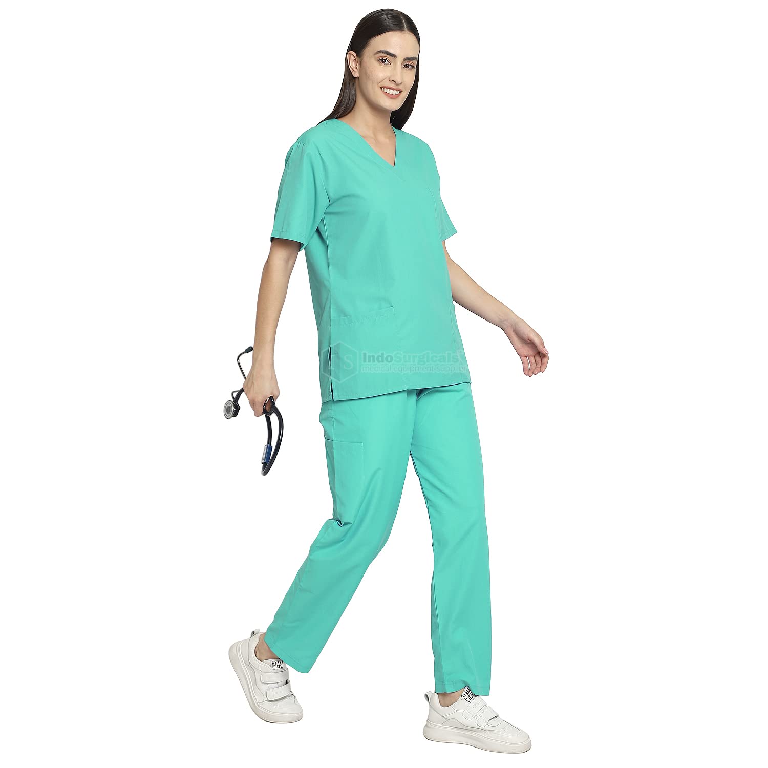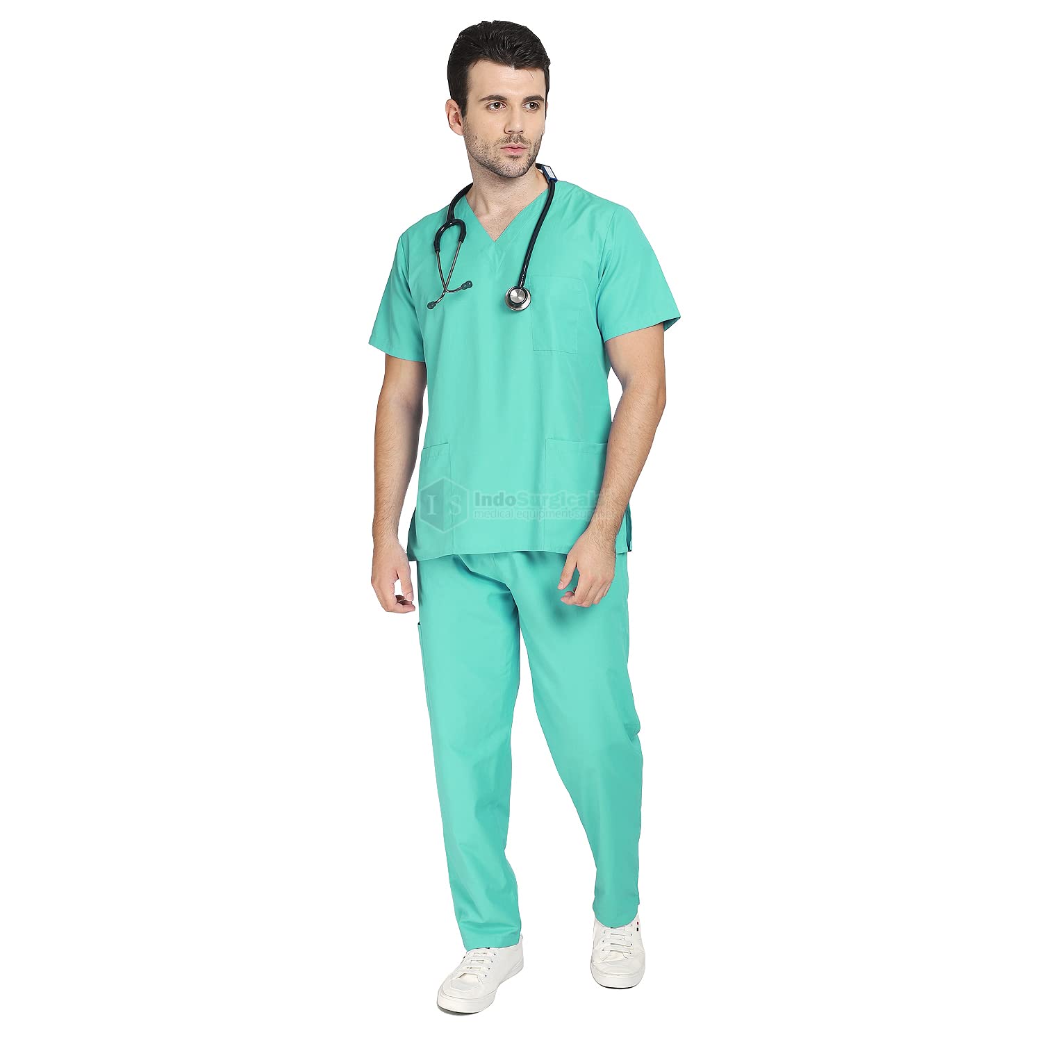 Unisex V-neck tunic styling. Side vents for easy movement and comfortable fit. Set-in short sleeves